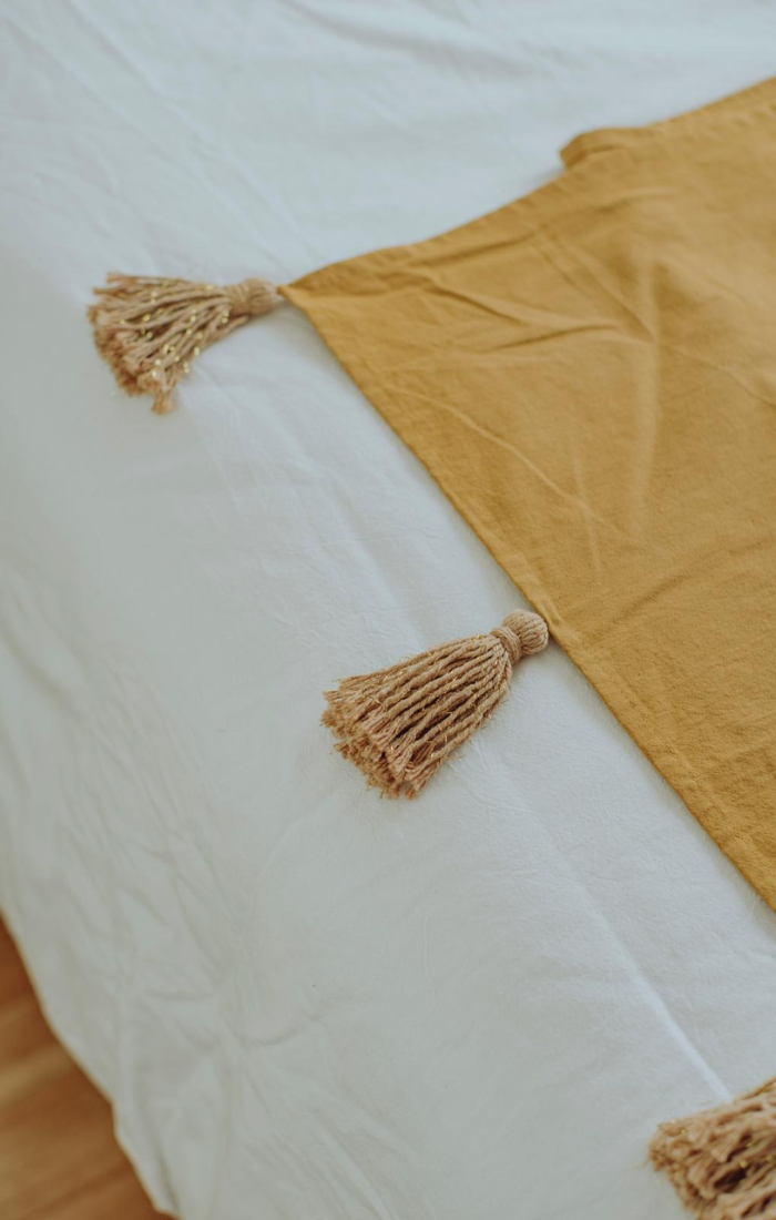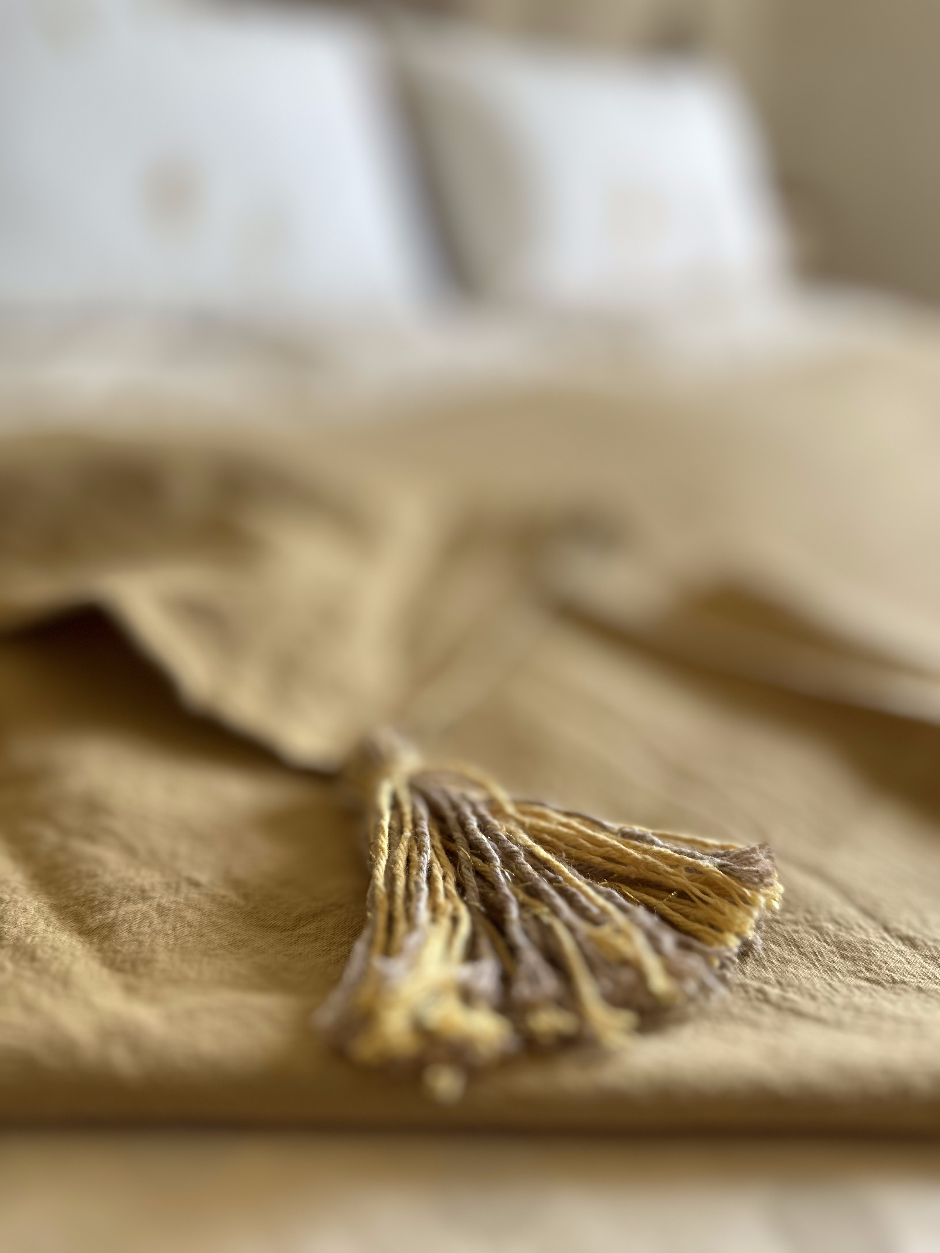 Confeccionada en tusor color avellana con borlas en hilo de algodón con detalles en dorado.