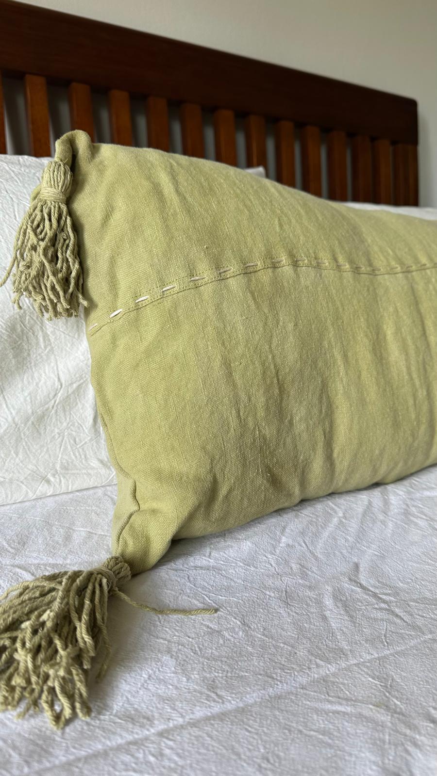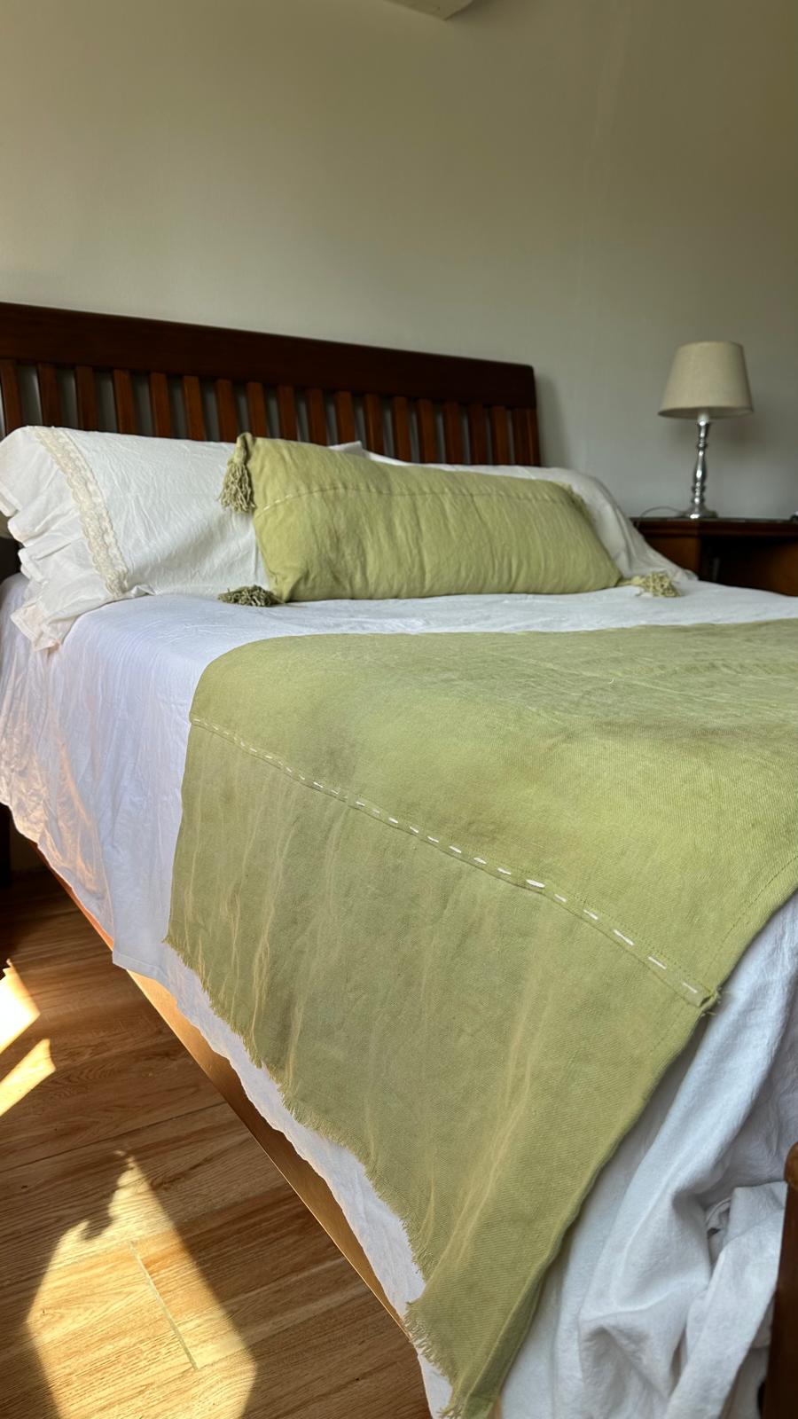 Pie de cama y almohadón de lino con borlas en algodón